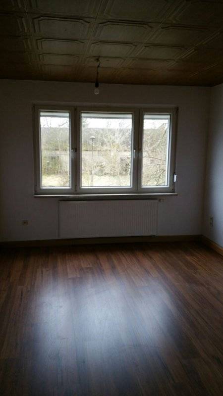 Die Küche, das Wohnzimmer, der Flur, das Schlafzimmer sind mit Laminat ausgestattet. Das Bad mit Badewanne ist gefliest.
